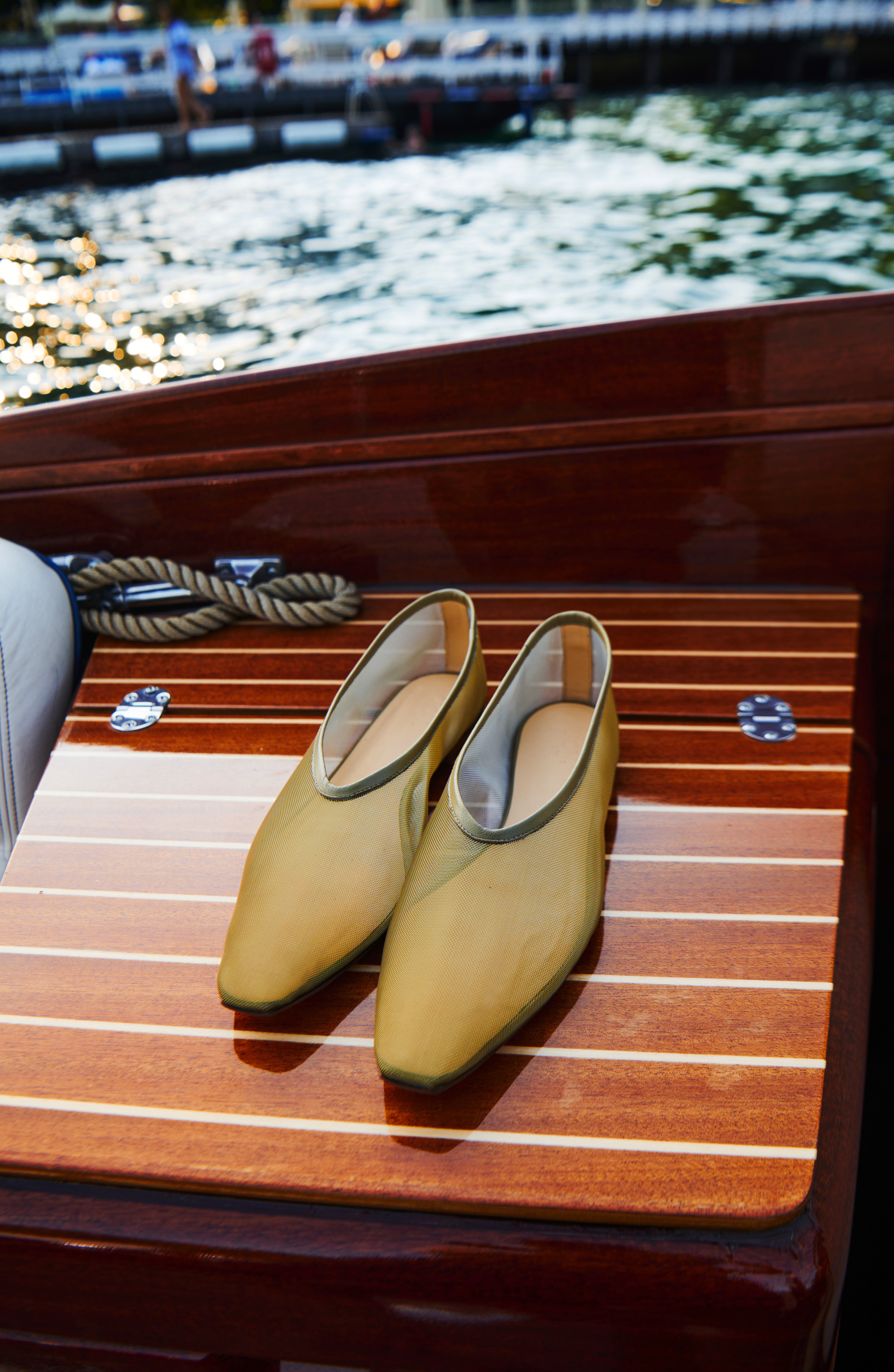 Description: Light olive square-toe mesh flats